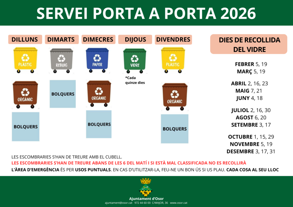 A aquesta notícia podreu trobar tota la informació relacionada amb el sistema de recollida de residus Porta a Porta a Osor.