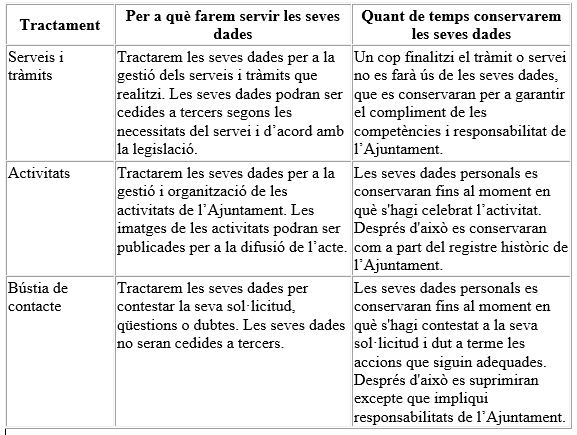 La base legal per al tractament de les seves dades és l’execució dels serveis que ens ha demanat i l’aplicació de les competències pròpies de l’Ajuntament.